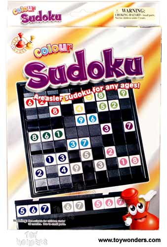 3385 Sudoku Game. Game set includes a board with storage, 81 number chips from 1 - 9 in 9 different colors, 1 puzzle table with 40 games, and 1 puzzle table answer. Box size: 7.5"Lx 0.8"Wx 11.25"H.