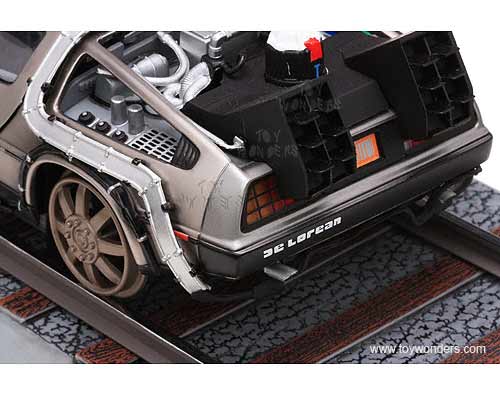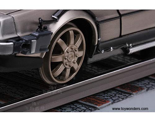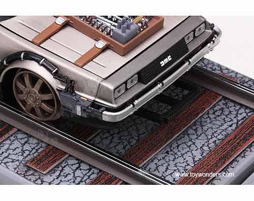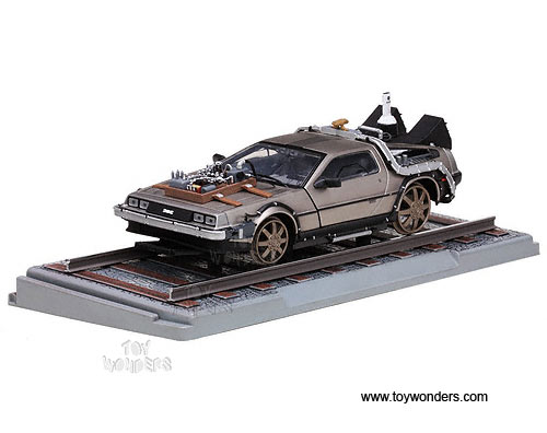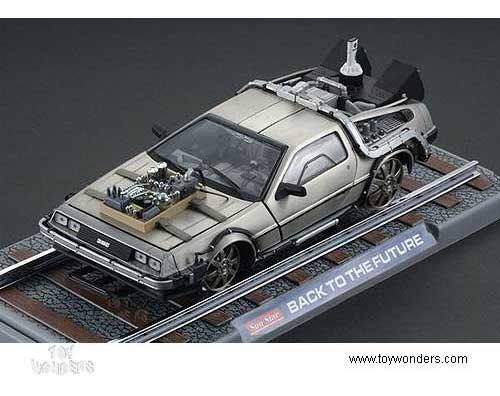 2714 SUN STAR - Back to The Future Part III DeLorean Railroad Edition. 1:18 scale diecast car. 10" long x 4"W x 3.5"H, diecast metal car with opening doors and hood. Detailed components. Sits on a display platform. Individually packed in a window box. Box is 14"L x 6.5"W x 5.5"H. Manufactured by Sunstar.