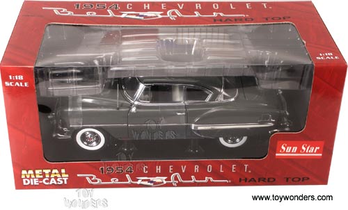 1701GY SUN STAR - 1954 Chevrolet Bel Air Hard Top. 1:18 scale diecast model car. This Chevy Belair is 11"L x 4"W x 3.5"H with opening hood/doors/trunk. Turnable front wheels. Mounted on a display stand. Manufactured by Sunstar. Box size: 14"L x 6.5"W x 6.25"H. 1701 in GRAY color. Individually packed in a window box.