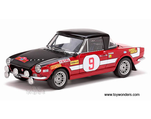 4945 Sun Star Classic Rally - Fiat 124 Abarth Race Car L.Trombotto/ M.Enrico #9 (Winner Rallye Dell' Isola d'Elba 1971). 1:18 scale diecast collectible model car. This Fiat 124 Abarth racing car is an 8.5"L x 3"W x 2.5"H die-cast metal car with openable doors, hood & trunk. Mounted on a display stand. Classic Rally collectibles. This Fiat 124 Abarth is manufactured by Sunstar. Individually packed in a window box. Box size: 14"L x 6.5"W x 5.15"H. Item 4945 is in RED color with Black hood & roof.