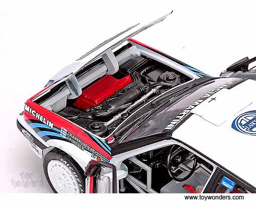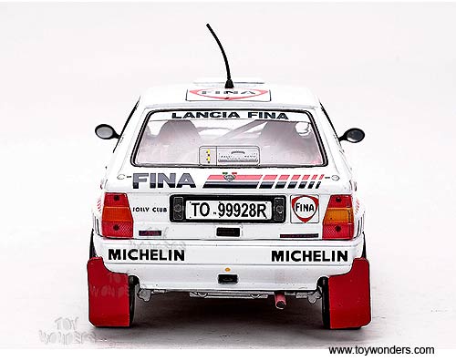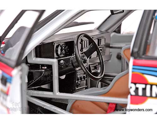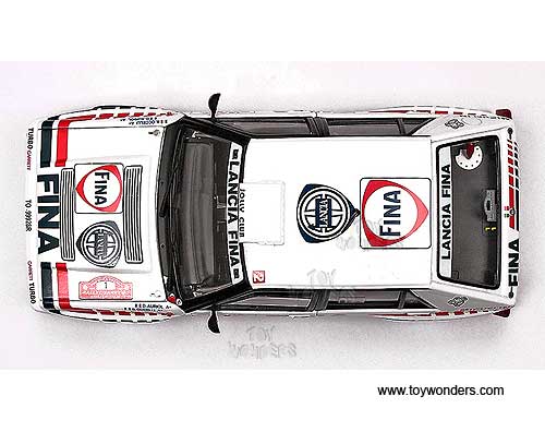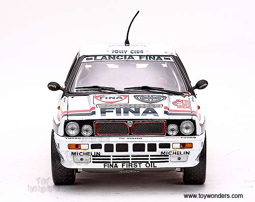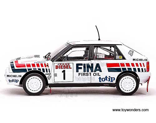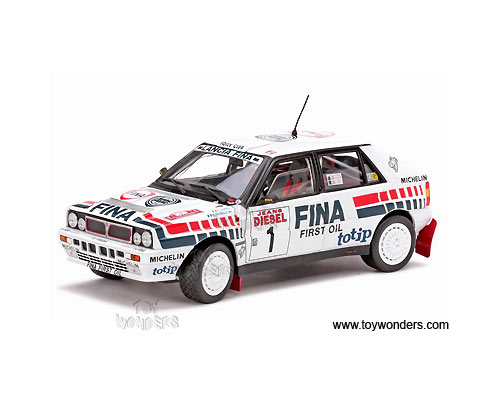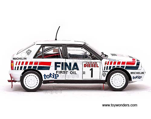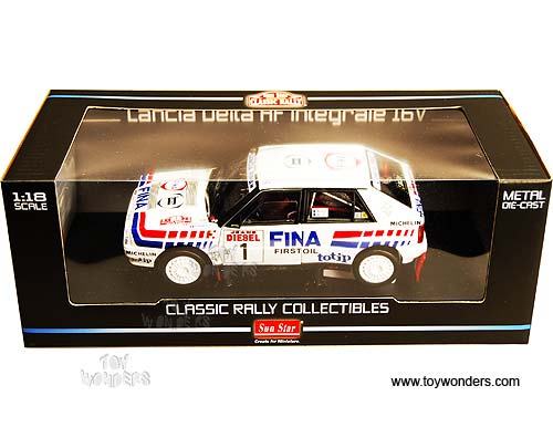 3119 Sun Star Classic Rally - Lancia Delta HF Integrale 16V Race Car D.Auriol / B.Occelli #1 (Winner 1991 Rallye Sanremo). 1:18 scale diecast collectible model car. This Lancia Delta HF Integrale 16V racing car is an 8.25"L x 3.25"W x 2.75"H die-cast metal car with openable doors & hood. Mounted on a display stand. Classic Rally collectibles. This Lancia Delta HF Integrale 16V is manufactured by Sunstar. Individually packed in a window box. Box size: 14"L x 6.5"W x 5"H. Item 3119 is in WHITE color.