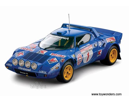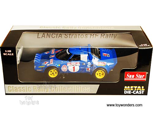 4512 Sun Star Classic Rally - Lancia Stratos Race Car B.Darniche/A.Mahé #1 (1977 Rally Elba). 1:18 scale diecast collectible model car. This Lancia Stratos racing car is an 8"L x 3.25"W x 2.25"H die-cast metal car with openable doors & hood. Turnable front wheels, steering function, detailed interior, engine & chassis. Mounted on a display stand. Classic Rally collectibles. This Lancia Stratos is manufactured by Sunstar. Individually packed in a window box. Box size: 14"L x 6.5"W x 5"H. Item 4512 is in BLUE color.