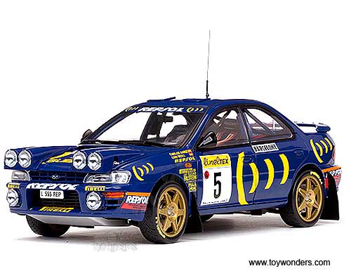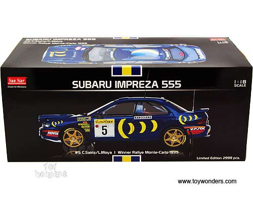 5503 Sun Star Classic Rally - Subaru Impreza 555 #5 C.Sainz/ L.Moya (Winner Rallye Monte-Carlo 1995). 1:18 scale diecast collectible model car. This Subaru Impreza racing car is a 9.25"L x 3.25"W x 2.75"H die-cast metal car with openable doors, hood & trunk. Sits on a display plaque. This Subaru Impreza is manufactured by Sunstar. Limited edition 1 of 2999 pcs. Individually packed in a window box. Box size: 14"L x 6.5"W x 6"H.