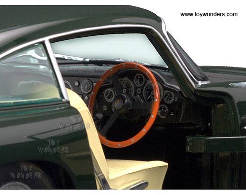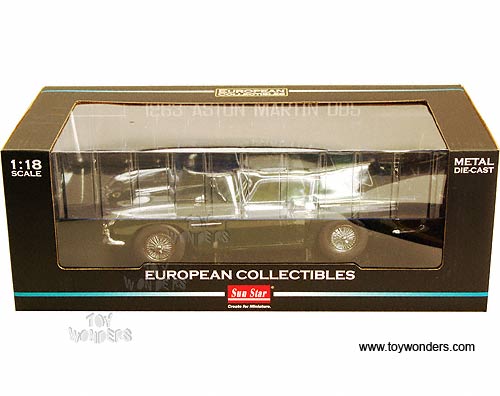 1001 Sun Star European - 1963 Aston Martin DB5 Hard Top. 1:18 scale diecast collectible model car. This Aston Martin DB5 is a 9.75"L x 3.5"W x 2.75"H die-cast metal car with openable doors & hood. Mounted on a display stand. European collectibles. This Aston Martin DB5 is manufactured by Sunstar. Individually packed in a window box. Box size: 14"L x 6.5"W x 5"H. 1001 is in BRITISH RACING GREEN.