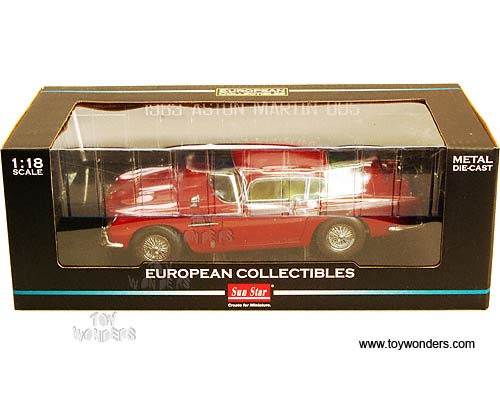 1002 Sun Star European - 1963 Aston Martin DB5 Hard Top. 1:18 scale diecast collectible model car. This Aston Martin DB5 is a 9.75"L x 3.5"W x 2.75"H die-cast metal car with openable doors & hood. Mounted on a display stand. European collectibles. This Aston Martin DB5 is manufactured by Sunstar. Individually packed in a window box. Box size: 14"L x 6.5"W x 5"H. 1002 is in DARK RED.