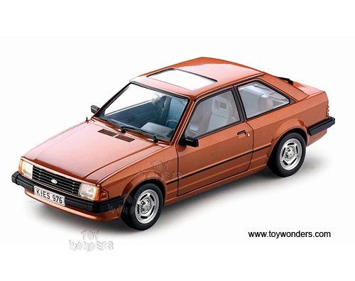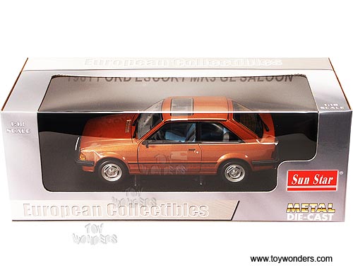 4976 Sun Star European - 1981 Ford Escort MK3 GL Saloon Hard Top w/ Sunroof. 1:18 scale diecast collectible model car. This Ford Escort MK3 GL Saloon is an 8.5"L x 3.25"W x 2.75"H die cast metal car with openable doors, hood & trunk. Turnable front wheels, steering function, detailed interior, engine & chassis. Mounted on a display stand. European collectibles. This Ford Escort MK3 GL Saloon is manufactured by Sunstar. Individually packed in a window box. Box size: 14"L x 6.5"W x 5.1"H. Item 4976 is in AZTEC BRONZE color.