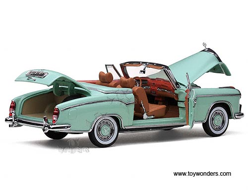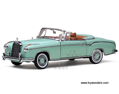 3554 Sun Star European - 1958 Mercedes-Benz 220SE Cabriolet Convertible. 1:18 scale diecast collectible model car. This Mercedes-Benz 220SE Cabriolet is a 10"L x 4"W x 3"H die-cast metal car with openable doors, hood & trunk. Mounted on a display stand. European collectibles. This 1958 Mercedes-Benz 220SE Cabriolet is manufactured by Sunstar. Individually packed in a window box. Box size: 14"L x 6.5"W x 5"H. 3554 is in LIGHT GREEN color.