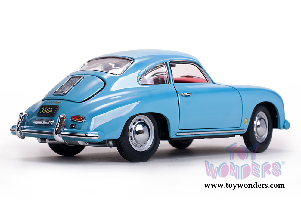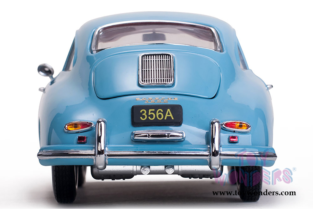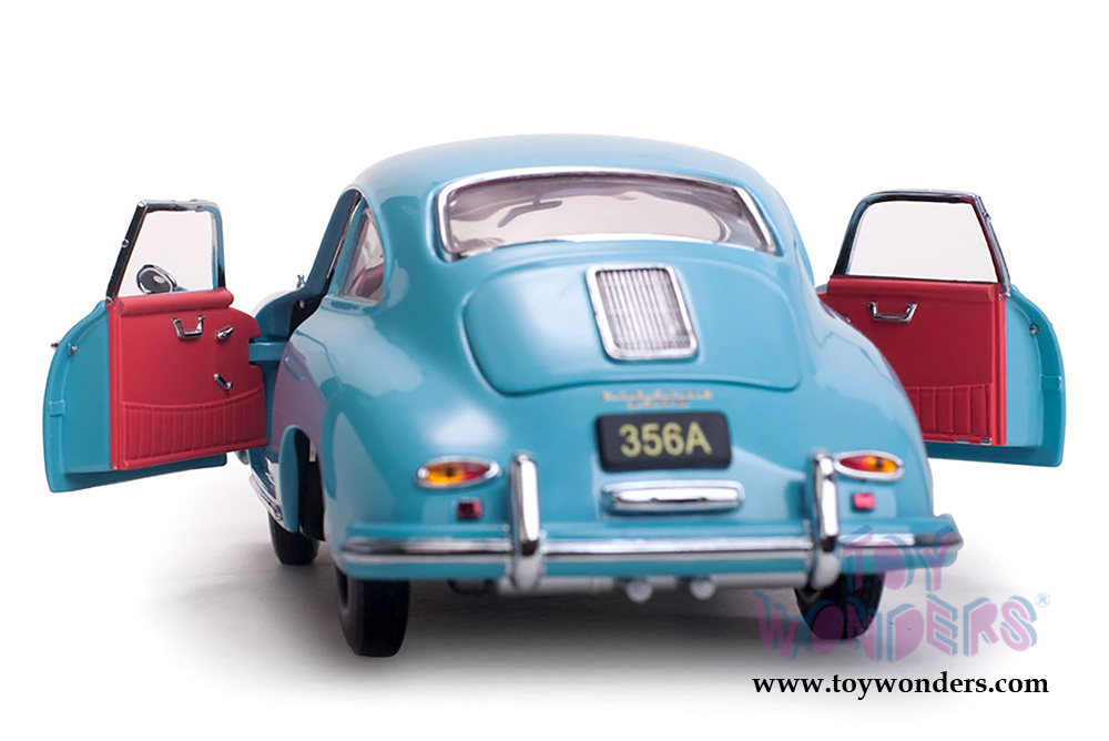 1329 Sun Star European - 1957 Porsche 356A 1500 GS Carrera GT Coupé. 1:18 scale diecast model car. This Porsche is 8.5"L x 3.5"W x 2.5"H with opening hood/doors/trunk. Turnable front wheels, steering function, detailed interior, engine and chassis. Mounted on a display stand. Manufactured by Sunstar. Individually packed in a window box. Box size: 12"L x 6.5"W x 5"H. 1329 is in Meissen BLUE Color.
