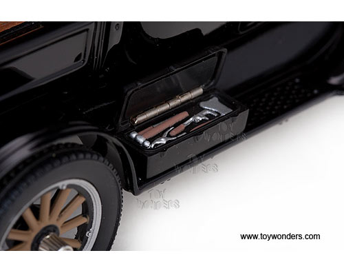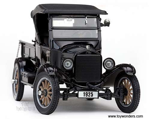 1860BK Sun Star - 1925 Ford Motel T Roadster Pickup Truck. 1:24 scale diecast collectible model car. Sits on a display stand. This Ford Model-T Roadster Pick-up is a 6.25"L x 2.75"W x 3"H die-cast metal car with openable hood, doors & tailgate. This 1925 Ford Model T Roadster Pick up is made by Sunstar. 1860 is in BLACK color. Individually packed in a window box WB. Box size is 10.5"L x 5.75"W x 5.25"H.