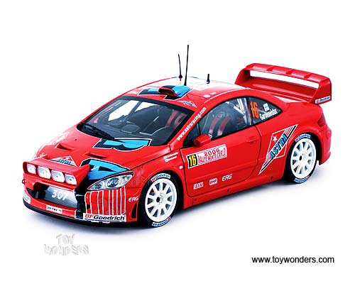 4695 Sun Star Modern Rally - Peugeot 307 WRC T.Gardemeister / J.Honkanen #16 (Rallye Monte-Carlo 2006). 1:18 scale diecast collectible model car. This Peugeot 307 WRC racing car is a 9.75"L x 3.25"W x 2.75"H die-cast metal car with openable doors & hood. Turnable front wheels, steering function, detailed interior, engine & chassis. Mounted on a display stand. Sponsors inlclude Astra, BFGoodrich, ERG, and more. Modern Rally collectibles. This Peugeot 307 WRC is manufactured by Sunstar. Individually packed in a window box. Box size: 14.25"L x 6.5"W x 6.25"H.