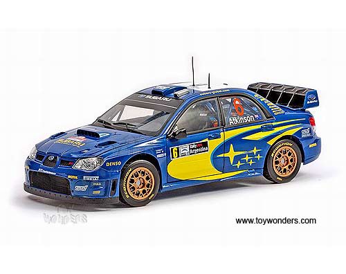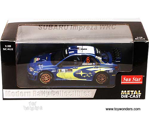 4396 Sun Star Modern Rally - Subaru Impreza WRC07 Race Car C.Atkinson/S.Prevot #6 (Rally Argentina 2008). 1:18 scale diecast collectible model car. This Subaru Impreza WRC07 racing car is a 9.5"L x 3.5"W x 2.75"H die cast metal car with openable doors, hood & trunk. Turnable front wheels, steering function, detailed interior, engine & chassis. Mounted on a display stand. Modern Rally collectibles. This Subaru Impreza WRC07 is manufactured by Sunstar. Individually packed in a window box. Box size: 14"L x 6.5"W x 6"H. Item 4396 is in BLUE color.