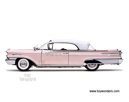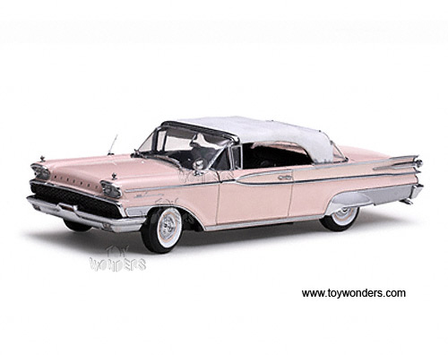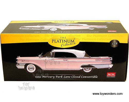 5165 Sun Star Platinum - 1959 Mercury Park Lane Closed Convertible. 1:18 scale diecast collectible model car. This Mercury Parklane is about 12"L diecast metal car with openable hood, doors, and trunk. The 1959 Mercury Parklane is manufactured by Sun Star. Item 5165 is in BERMUDA SAND color with white bonnet. Individually packed in a box. Box size: 15"L x 6.75"W x 6"H.
