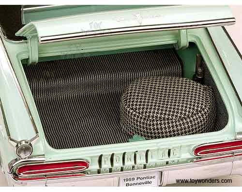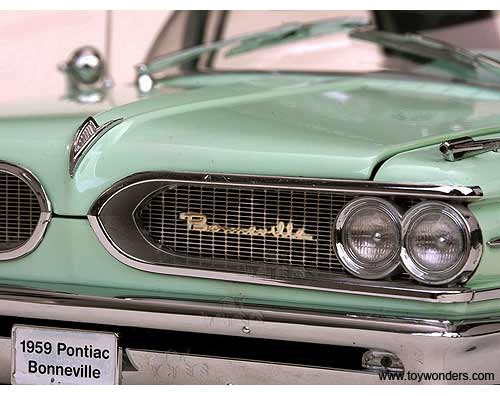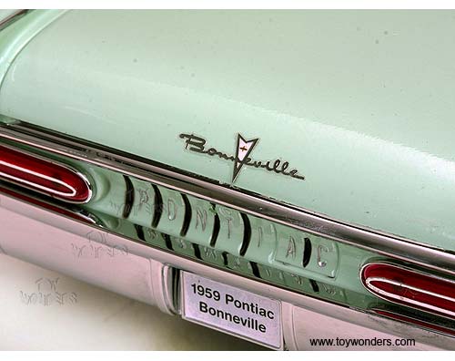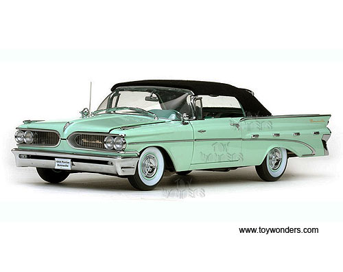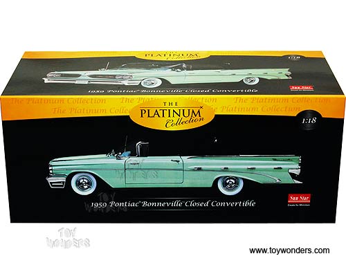 5192 Sun Star Platinum - 1959 Pontiac Bonneville Closed Convertible. 1:18 scale diecast collectible model car. This Pontiac Bonneville is about 12" L diecast metal car with openable hood, doors and trunk. Manufactured by SunStar. 5192 is in SEASPRAY GREEN color. Individually packed in a box. Box size: 15"Lx 6.75"Wx 6"H. GM is a trademark of the General Motors Corporation.
