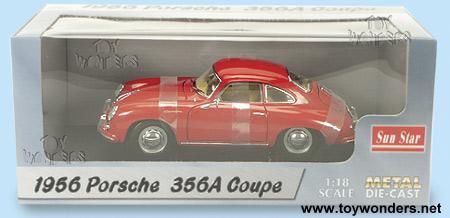 1322R SUN STAR - 1956 Porsche 356A Coupe Scale: 1:18 Dimensions: 8.25"L x 3.5"W x 2.75"H 1956 Porsche 356A Coupe die cast metal oldies sports car with opening doors/bonnet/trunk, spare tire in trunk, workable steering, and free wheel action. Detailed components. Sits on a extendable display platform. Individually packaged in window box Box: 12.5"W x 4.25"H x 6.5"D Manufactured by SunStar Color: Red