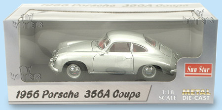 1320S SUN STAR - 1956 Porsche 356A Coupe Scale: 1:18 Dimensions: 8.25"L x 3.5"W x 2.75"H Porsche die cast metal oldies sports car with opening doors, bonnet, and trunk, spare tire in the trunk, workable steering, and free wheel action. Detailed components. Sits on an extendable display platform. Individually packaged in a window box Box: 12.5"W x 4.25"H x 6.5"D Manufactured by Sunstar Color: Silver