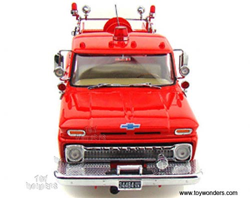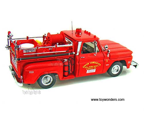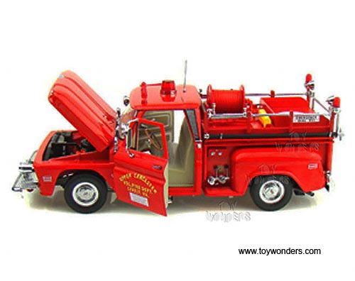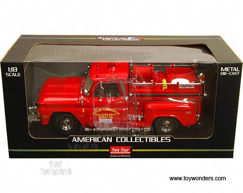 1383R Sun Star USA - 1965 Chevrolet C-20 Fire Engine. 1:18 scale diecast collectible car. This 1965 Chevy C20 fire truck is a 10.75"Lx 4.5"Wx 4"H die cast metal has opening hood & doors. Turnable front wheels, steering function, detailed interior, engine and chassis. Sits on a display plaque. Manufactured by SunStar. U.S.A. collectilbles. 1383 in RED color. Individually packed in a window box. Box size: 14"Lx 6.5"Wx 6.25"H.