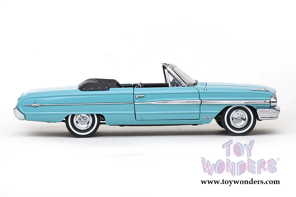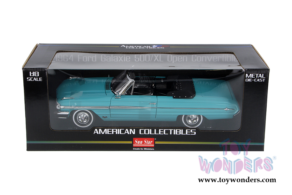 1424 SUN STAR USA - 1964 Ford Galaxie 500/XL Open Convertible. 1:18 scale diecast collectible model car. This Ford Galaxie 500 is an 11.25"Lx 4"Wx 3"H die cast metal car with openable hood & doors. Turnable front wheels, steering function, detailed interior, engine and chassis. Sits on a display plaque. This Ford Galaxie 500 is manufactured by SunStar USA collectilbles. 1424 is in GREEN color. Individually packed in a window box. Box size: 14.25"Lx 6.5"Wx 5.1"H.