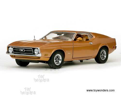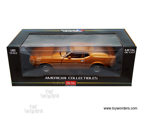 3619 SUN STAR USA - 1971 Ford Mustang Sportsroof Hardtop. 1:18 scale diecast collectible model car. This Ford Mustang Sportsroof is a 10.5"Lx 3.75"Wx 2.5"H diecast car with openable doors, hood, and trunk. Turnable front wheels, steering function, detailed interior, engine, and chassis. Sits on a display plaque. This 71 Ford Mustang Sportsroof is manufactured by Sun Star. American collectibles. 3619 is in MEDIUM BROWN color. Individually packed in a window box. Box size: 14"Lx 6.5"Wx 5"H.