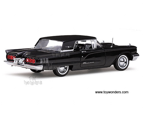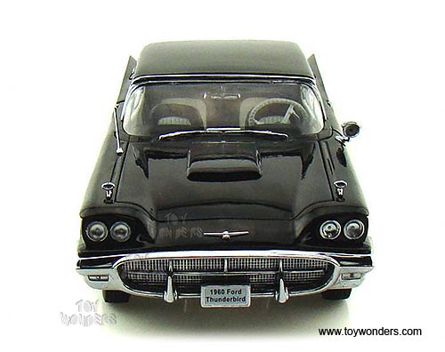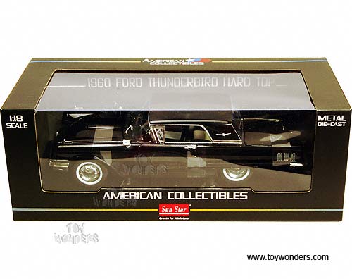 4304 SUN STAR USA - 1960 Ford Thunderbird Hard Top. 1:18 scale diecast collectible model car. This Ford Thunderbird is an 11"L x 4"W x 2.75"H with openable hood, doors & trunk. Turnable front wheels, steering function, detailed interior, engine and chassis. U.S.A. collectibles. Mounted on a display stand. This 1960 Ford Thunderbird is manufactured by Sunstar. Individually packed in a window box. Box size: 14"L x 6.5"W x 5"H. Item 4304 is in RAVEN BLACK color.