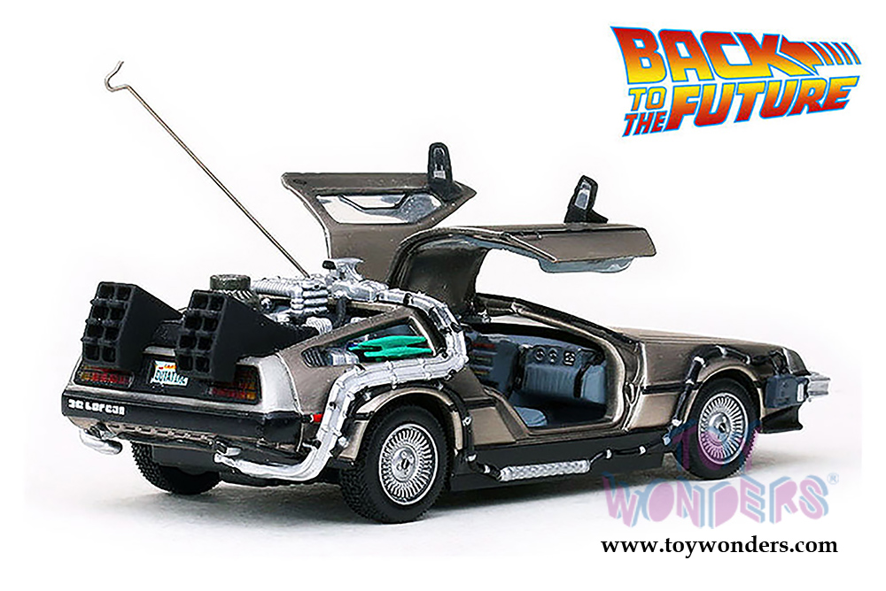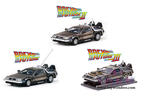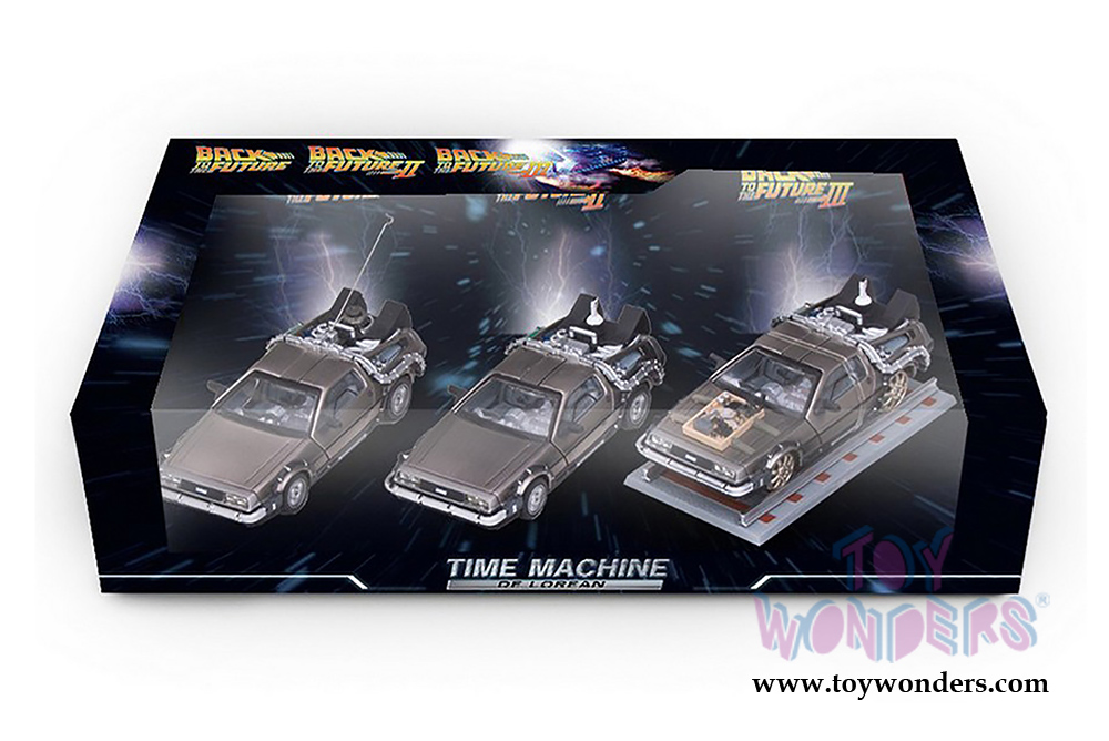 24016 Sun Star Vitesse - Back To The Future Part I, II, III DeLorean Time Machines Set. 1:43 scale diecast collectible model cars. These DeLorean are 4"L x 1.75"W x 1"H, diecast metal cars with opening gullwing doors. Set of 3 cars packed in a decorated window box. Box size: 12"Lx 6"Wx 3"H. This DeLorean set edition is manufactured by Sunstar. 24016 is in STAINLESS STEEL color.