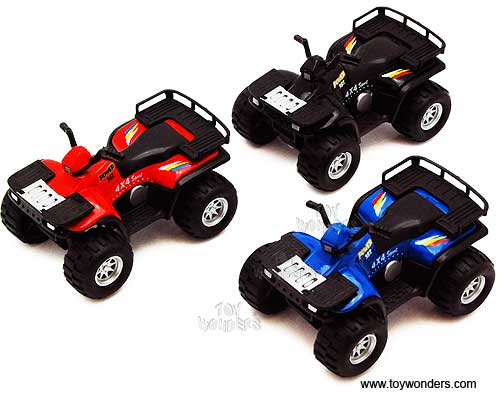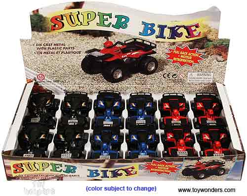9998D Super Bike. This 4" diecast metal super 4x4 quad ATV features with pullback motor action. 12 pcs per display box and in assorted colors. 72 pcs per inner box.