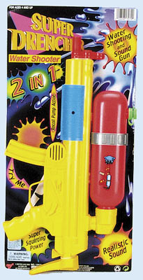 13079/2 Super Drencher (Water Gun). 17" long, water machine gun with recoil pump action, super squirting power, large water tank and mechanical gun sounds (no batteries required). Blister card size: 9.5" x 19.25". 12 pcs/inner.