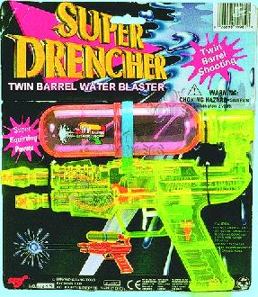 1100/6 Super Drencher Water Gun. 8.5" long, water gun with a twin barrel water blaster. With super squirting power. See-through tank lets you know when to reload. Blister card size: 8.75" x 10". 24 pcs/inner.