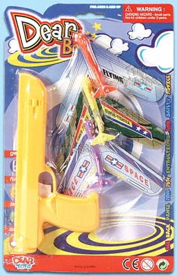 B003 Super Fighter. This flying toy includes a shooting gun and 3 mini planes. The gun enables the mini planes to be shot into the air and then glides in the air. Card size: 7"x11.5".