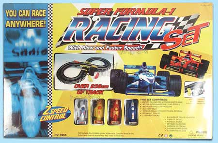 9056 Super Formula-1 Racing Set. 2 speed control. Set includes racing car w/ base, car bodies, various tracks, plunger hand controllers, bridges & fences. Requires 4 "D" batteries (not included). Box size: 26.75"Lx 1.75"Wx 17.5"H.