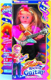 18212 Super Rockin Guitar Sandy. 18" rock n' roll singing doll w/ light-up earrings dressed in a glimmering outfit playing a guitar w/ blinking lights. In a TRY ME box. Includes 3 "AA" batteries. Box size: 9.25"Lx6"Wx19"H. 4 pcs/inner.