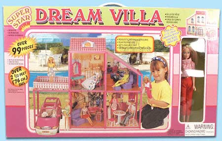 2.5' tall house full of furniture & decorated rooms plus balcony & garage. Includes 11.5" fashion doll.