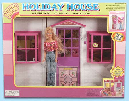 388SD Super Star Holiday House. 19" beautifully furnished house w/ decorative wall & floor coverings. Comes w/ 11.5" fashion doll. Working doorbell. 2 button cell batteries included. Box size: 21"Lx5"Wx16.25"H.