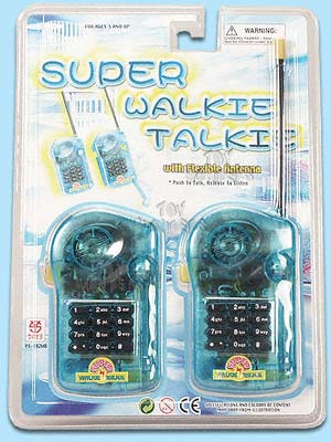 982MB Super Walkie Talkie. Walkie talkies w/ flexible antenna, signal keys, powerful signal & condenser mic. Each handset requires one "9V" battery. Card size: 5.25"x11.5".