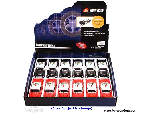 5420D Superior - 1955 Chevrolet Bel Air Police Car. 1:34 scale diecast collectible model car. This 1955 Chevy Bel Air is a 5.5"L x 2"W x 2"H diecast metal classic car with pullback motor action, openable doors and hood.  This 1955 Chevy Bel Air police car is manufactured by Superior/Sunnyside. 12 pcs per display box in assorted colors. 72 pcs per inner box. Z8. GM is a trademark of the General Motors Corporation.