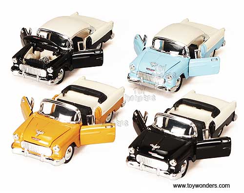 5720D Superior - 1955 Chevrolet Bel Air. 1:34 scale diecast collectible model car. 5.25"L x 2"Wx 1.5"H diecast metal classic 1955 Chevy Belair features openable doors & hood and pullback motor action. This Chevy Belair is manufactured by Superior/ Sunnyside. 48 pcs per inner box. 12 pcs per display box and in assorted colors and styles (6 hardtops and 6 convertibles). Z8. GM is a trademark of the General Motors Corporation.