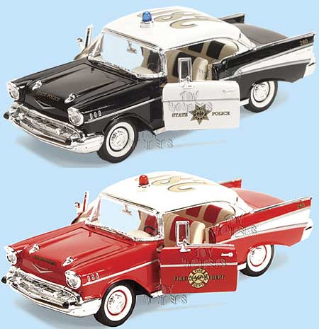 8403/4D 1957 Chevy Bel Air. 1:24 scale diecast model car. This 1957 Chevrolet BelAir is an 8.25" long x 3"W x 3.25"H, diecast metal classic oldies with opening doors/hood and free wheels. This 57 Chevy Bel-Air has either State Police or Fire Department logos and siren on roof. This 1957 Chevy Bel Air emergency vehicle is manufactured by Sunnyside/Superior. 4 pcs per display box. 8403 in assorted colors.