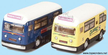 5859D Classic Coach. 5" long diecast metal bus with pullback motor action. Opening side door. These classic coach buses are approximately 1:38 in scale. Manufactured by Superior. Sunnyside. 12 pcs per display box and in assorted colors. 60 pcs per inner box.