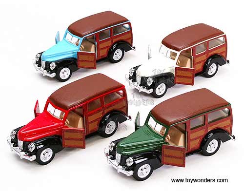 5706D Superior - 1940 Ford Woody Wagon. 1:38 scale diecast collectible model car. This 1940 Ford Woody Wagon is a 5.25"L x 2"W x 2.25"H die-cast metal car with openable doors, and pull back motor action. This 40 Ford Woody Wagon is manufactured by Superior/ Sunnyside. 12 pcs per display box and in assorted colors. 48 pcs per inner box. Z8