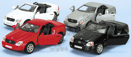 5738/39D/8 1996 Mercedes Benz SLK 230. 1:28 scale diecast model car. 5.5" long, die-cast metal sports cars with pullback motor action and openable doors/hood Superior; Sunnyside. Display of 12 pcs. 5738/39D in assorted colors. 48 pcs/inner. Z8.