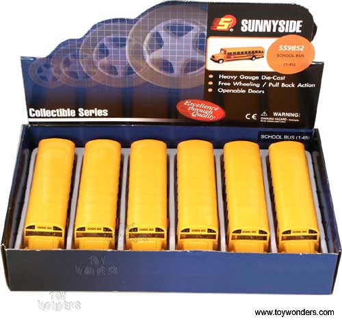 9852D Superior - School Bus. 1:45 scale diecast model. These 8.5" diecast collectible metal yellow school bus have opening front & rear doors, moveable stop sign, and pullback motor action. These yellow school buses are manufactured by Superior/ Sunnyside. 6 pcs per display box. 36 pcs per inner box.