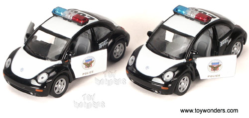 5415D Superior - Volkswagen New Beetle Police. 1:32 scale diecast collectible model car. This VW is 5"Lx 2"Wx 2.25"H. Diecast metal, classic city police car with pullback motor action and openable doors & hatch back. Manufactured by Superior/ Sunnyside. 12 pcs per display box. 5415 in BLACK/WHITE colors. Z8