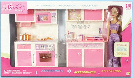 31701/3 Sweet Home sets. 3 assorted styles in laundry set, kitchen set and kitchen counter set. Each set includes 11.5" fashion doll. Also have lights and sounds. Requires "AA" batteries. Box size: 21.75"Lx3"Wx12.5"H.