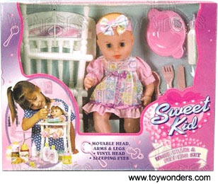 88603NC Sweet Kid Set. 10.5" doll comes with high chair and feeding set. The doll has movable arms and legs, vinyl head, and eyes that open and shut. Two assorted styles. Box size: 15"Lx 4"Wx 12"H.