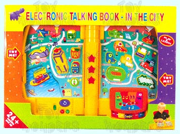 9022E Talking Book: In The City (English). 17" fold out electronic learning book. Activities introduce objects & sound recognition & reinforce memory skills and more. In a TRY ME box. Includes 3 "AA" batteries. Box size: 19.5"Lx2.5"Wx14.25"H.