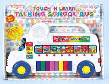 SC383 Talking School Bus 15" talking school bus that has eight realistic animal & vehicle sounds. 26 harmony melodies. 8-note keyboard. in a TRY ME box. includes 2 "AA" batteries. box size: 15.25"Lx2.5"Wx12"H.