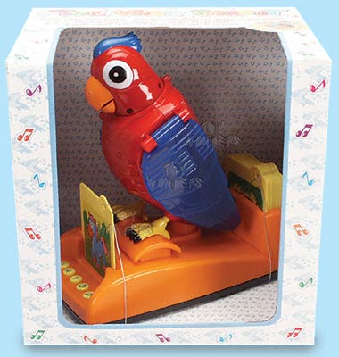 SC631 The Wise Parrot. 11.5" tall talking parrot w/ animated head. Game: search for correct card to insert. Plays animal sounds & melodies. Includes 4 "AA" batteries. Box size: 11.5"Lx9.5"Wx11.5"H.