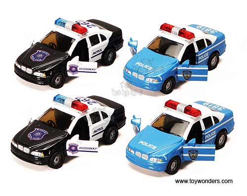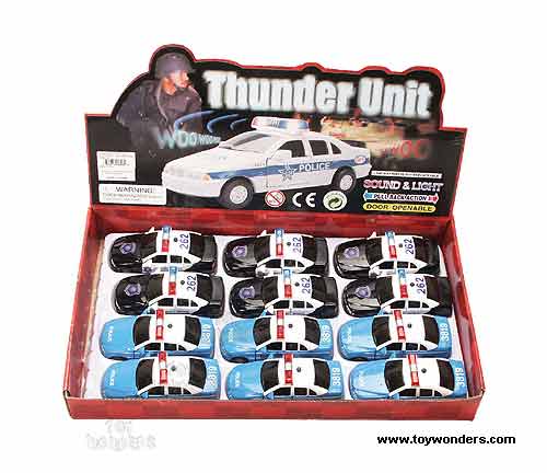 994SL Thunder Unit Police Car with Sounds and Lights. This 4.75" diecast metal city and state trooper style police cars with pullback motor action. This police car comes with IC sounds and lights. 12 pcs per display and in assorted styles and colors. 24 pcs per inner box.