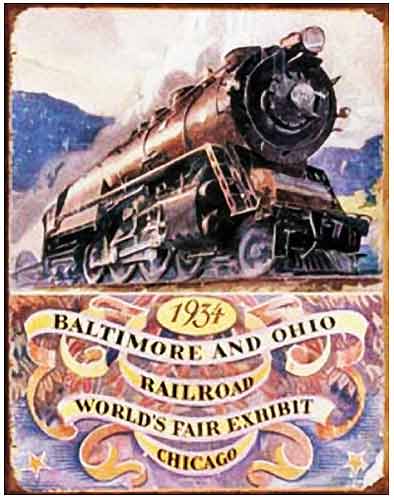 TD-1447 1934 Baltimore And Ohio Railroad nostalgic tin sign. Train or locomotive Collector metal signs. A collection of yesterday's signs. Great for decorating homes, offices, restaurants, etc. Lithographed steel metal. Mounted on a black 16" x 20" card. TD1447.