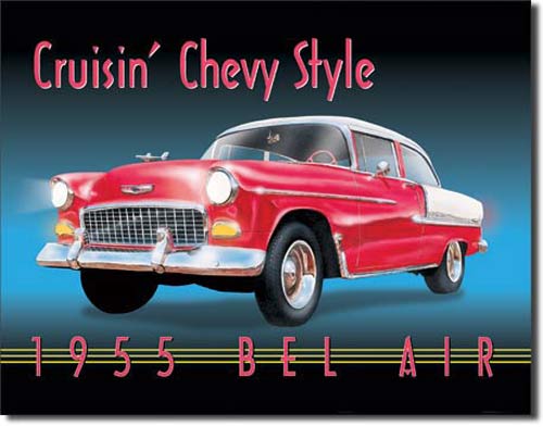 TD-728 1955 Chevrolet Belair (Cruisin' Chevy Style) tin sign. Collector metal signs. A collection of yesterday's signs. Great for decorating homes, offices, restaurants, etc. TD728 Lithographed steel metal. Tin sign size is 16"W x 12.5"H. Mounted on a black 20" x 16" card. GM is a trademark of the General Motors Corporation.