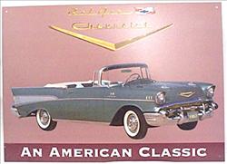 TG-428 1957 Chevy Belair nostalgic tin sign. Collector metal signs. A collection of yesterday's signs. Great for decorating homes, offices, restaurants, etc. Lithographed steel metal. TG428 Size: 17.25"W x 12.5"H. Mounted on a 20" x 16" black card. GM is a trademark of the General Motors Corporation.